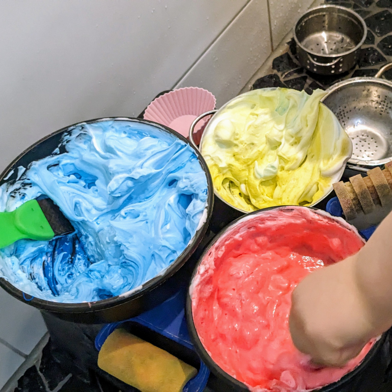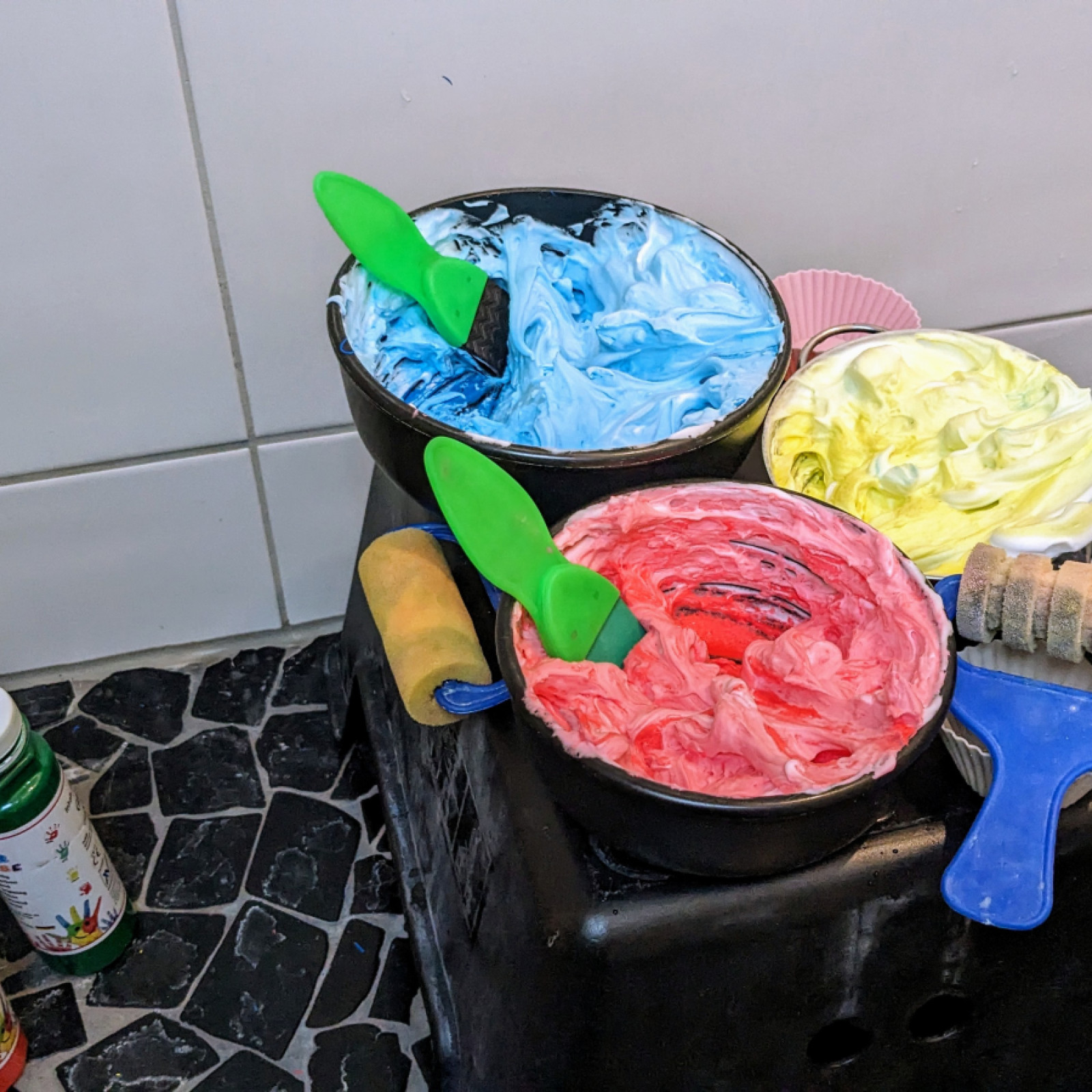 Wahrnehmung und Bewegung sind wichtige Säulen in der Frühkindlichen Entwicklung. Ich distanziere mich von „Schablonenarbeit“, also von vorgefertigten Bastelangeboten. Ich gebe keine Eichhörnchen-Schablone heraus und verlange von den Kindern, dass sie diese ausschneiden und braun anmalen, damit Eltern oder Großeltern etwas zu Hause aufhängen können. Bei einem solchen Angebot findet keine Kreativität statt. Wenn beim Malen von einer Wiese nur grüne Stifte benutzt werden dürfen, schränke ich die Fantasie und Kreativität der Kinder extrem ein und nehme ihnen jeden Spaß. Es geht mir also nicht darum, etwas bestimmtes herzustellen, sondern um den Weg, das Tun an sich. Ich habe oft von Eltern die Frage gehört, ob wir nichts basteln würden, weil die Kinder nie etwas mitbringen. Tatsächlich finden oft Angebote statt, doch sehen tun die Eltern das nur an dreckiger Kleidung und zerzausten Haaren :-) Es wird mit Rasierschaum gematscht, im Garten aus Rasenschnitt, gehäckselten Ästen und Sand eine Suppe gekocht und sich mit Farbe am ganzen Körper angemalt. Ein Ergebnis gibt es dabei nicht, zumindest ist es nicht sichtbar, denn es befindet sich in den Köpfen der Kinder. Bei diesen Tätigkeiten entwickelt sich die gesamte Wahrnehmung und diese ist die Basis für alles, was danach kommt.
